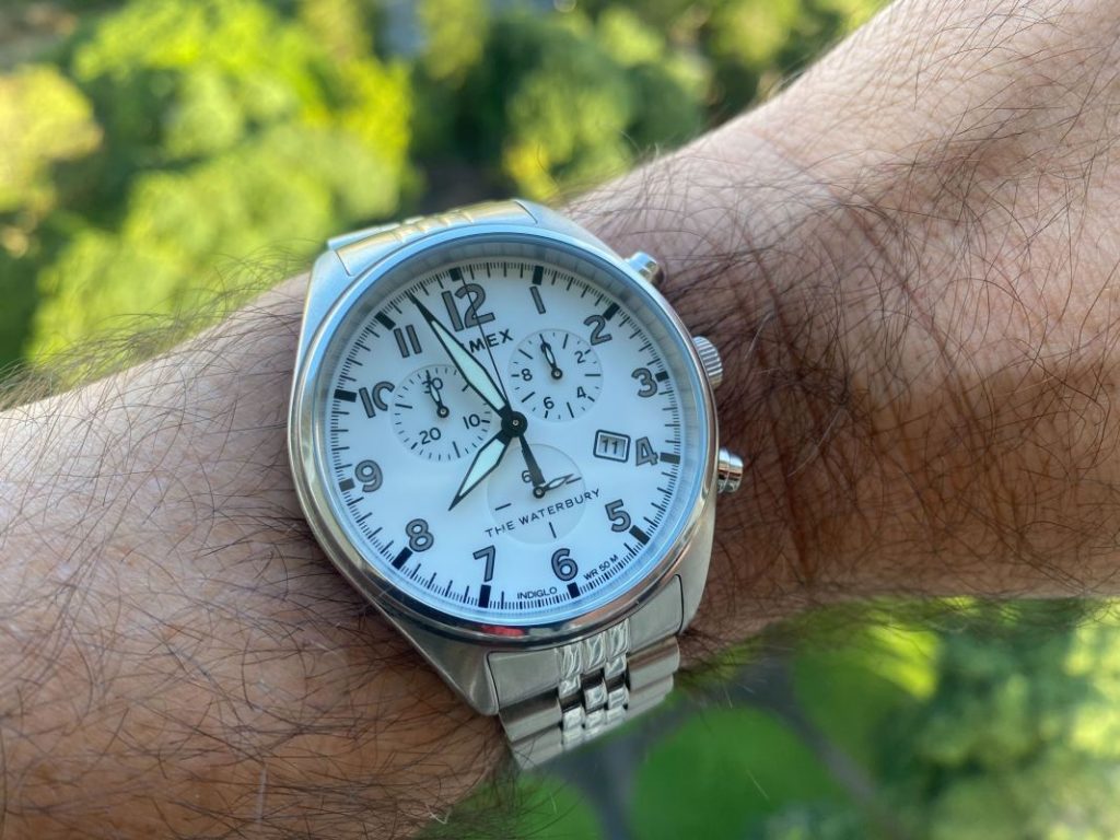 The Timex Waterbury White Dial Chronograph is available at Walmart for $134, but it’s worth far more than that in my opinion. That’s actually 21% lower than the manufacturer’s suggested retail price of $169.